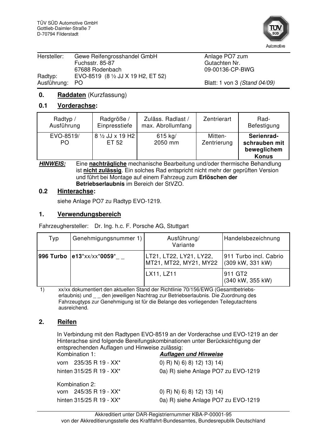 Dieses Gutachten (ece) bezieht sich auf die Alufelge co-rod EVO-8519 in der Ausführung ET 0, Mittenloch 0 mm . Im PDF findest du typischerweise zulässige Reifengrößen, Auflagen/Anbauhinweise und – je nach Dokument – Hinweise zur Eintragung.