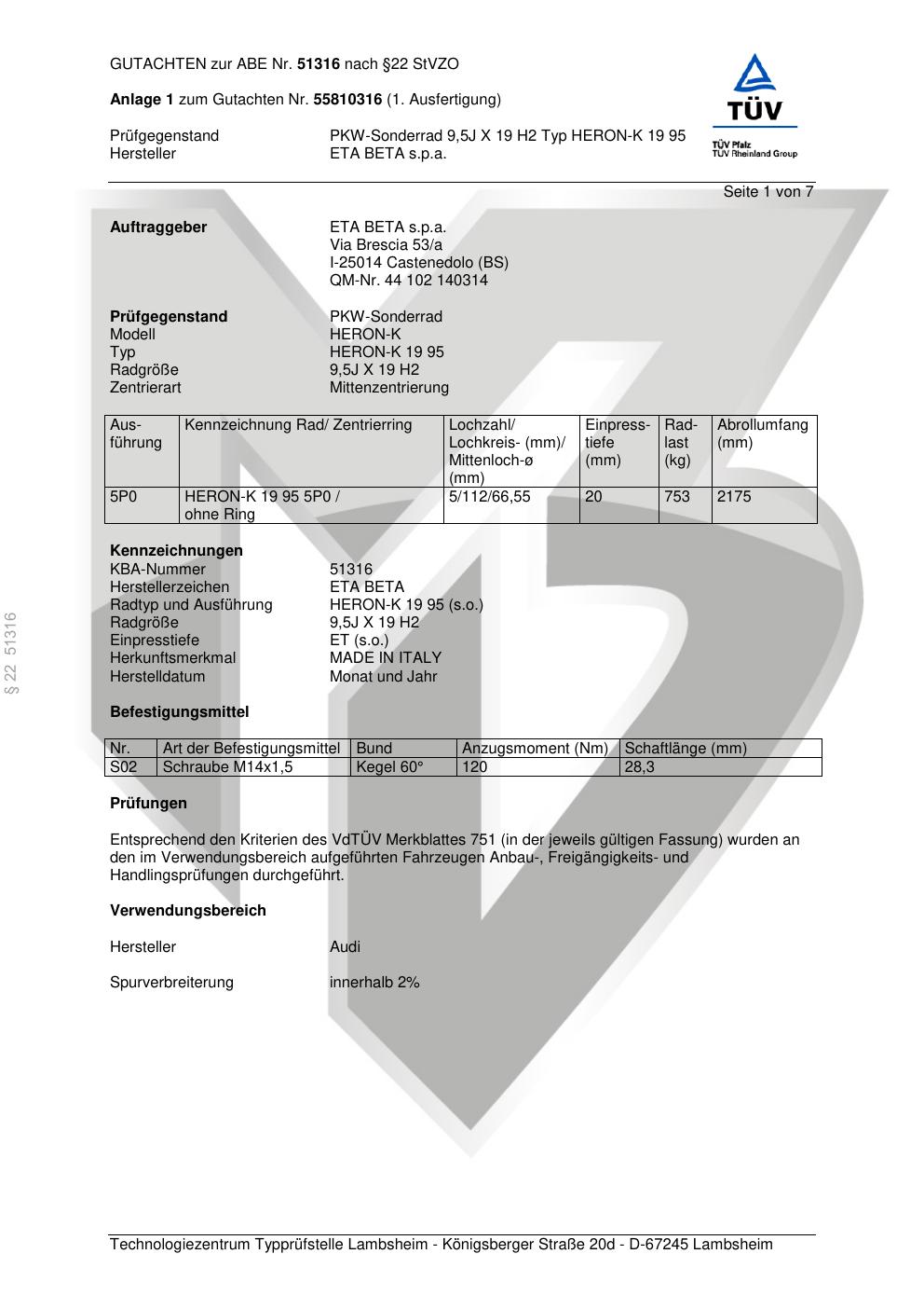 Dieses Gutachten (abe) bezieht sich auf die Alufelge ETA BETA s.p.a. HERON-K 19 95 in der Ausführung ET 0, Mittenloch 0 mm (KBA 51316). Im PDF findest du typischerweise zulässige Reifengrößen, Auflagen/Anbauhinweise und – je nach Dokument – Hinweise zur Eintragung.