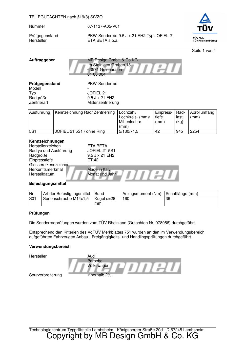 Felgengutachten / teilegutachten für Alufelgen ETA BETA s.p.a. JOFIEL 21 (ET 0, Mittenloch 0 mm) (Zertifikatsnummer 07-1137-a05-v01). Hier kostenlos als PDF herunterladen. Der Download-Link ist 24 Stunden gültig und kann bis zu zwei Mal verwendet werden.