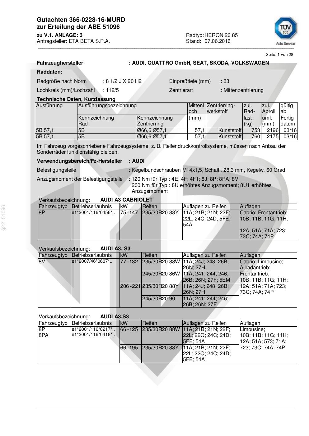 Dieses Gutachten (abe) bezieht sich auf die Alufelge ETA BETA s.p.a. HERON 20 85 in der Ausführung ET 0, Mittenloch 0 mm (KBA 51096). Im PDF findest du typischerweise zulässige Reifengrößen, Auflagen/Anbauhinweise und – je nach Dokument – Hinweise zur Eintragung.