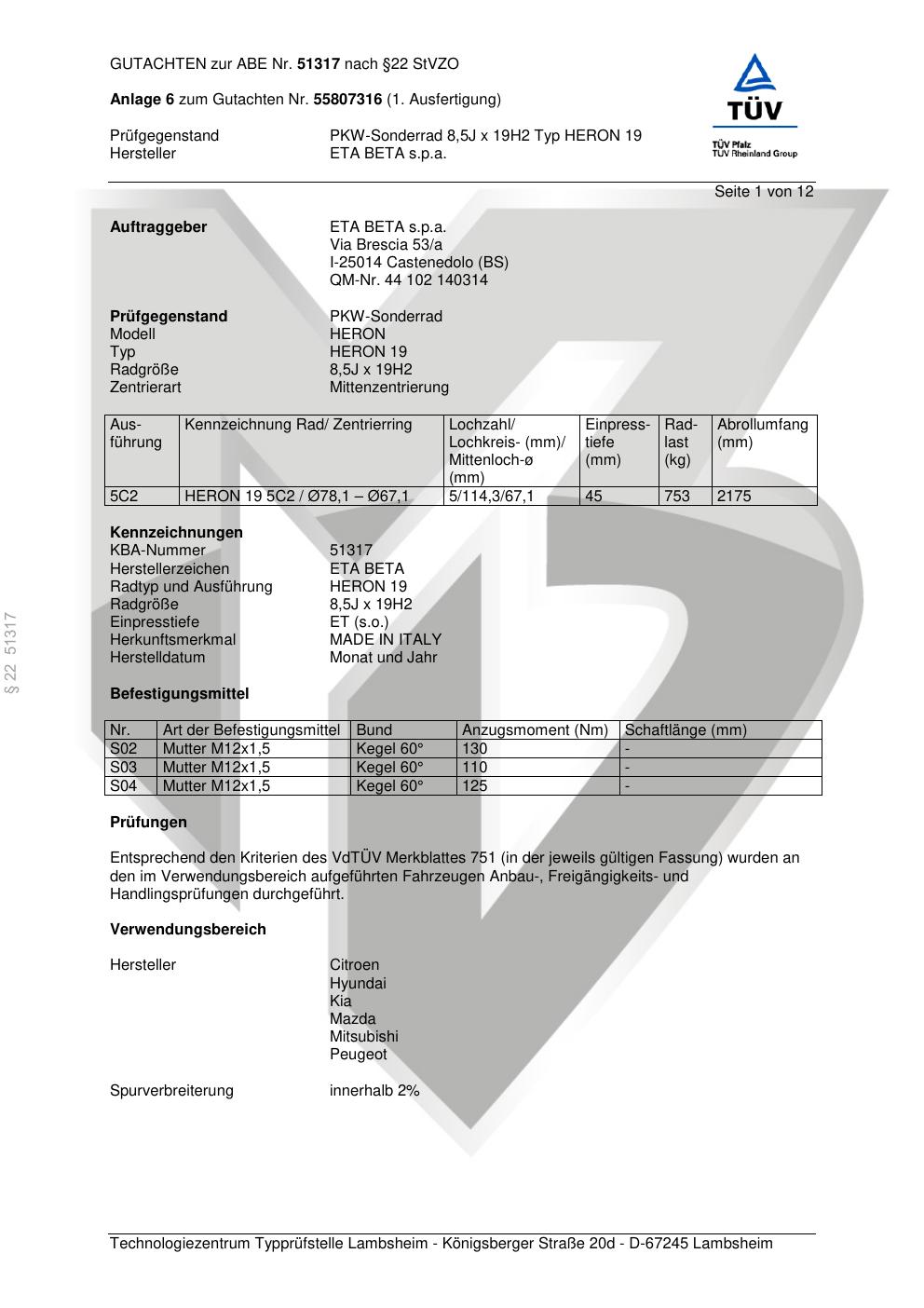 Dieses Gutachten (abe) bezieht sich auf die Alufelge ETA BETA s.p.a. HERON 19 in der Ausführung ET 0, Mittenloch 0 mm (KBA 51317). Im PDF findest du typischerweise zulässige Reifengrößen, Auflagen/Anbauhinweise und – je nach Dokument – Hinweise zur Eintragung.