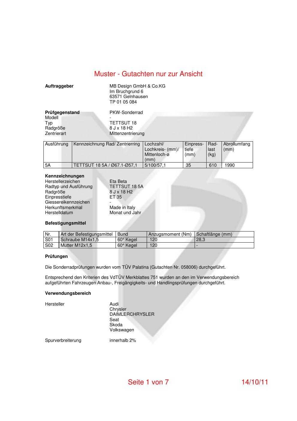 Felgengutachten / teilegutachten für Alufelgen ETA BETA s.p.a. TETTSUT 18 5A (ET 0, Mittenloch 0 mm) (Zertifikatsnummer 05-1246-a02-v02). Hier kostenlos als PDF herunterladen. Der Download-Link ist 24 Stunden gültig und kann bis zu zwei Mal verwendet werden.