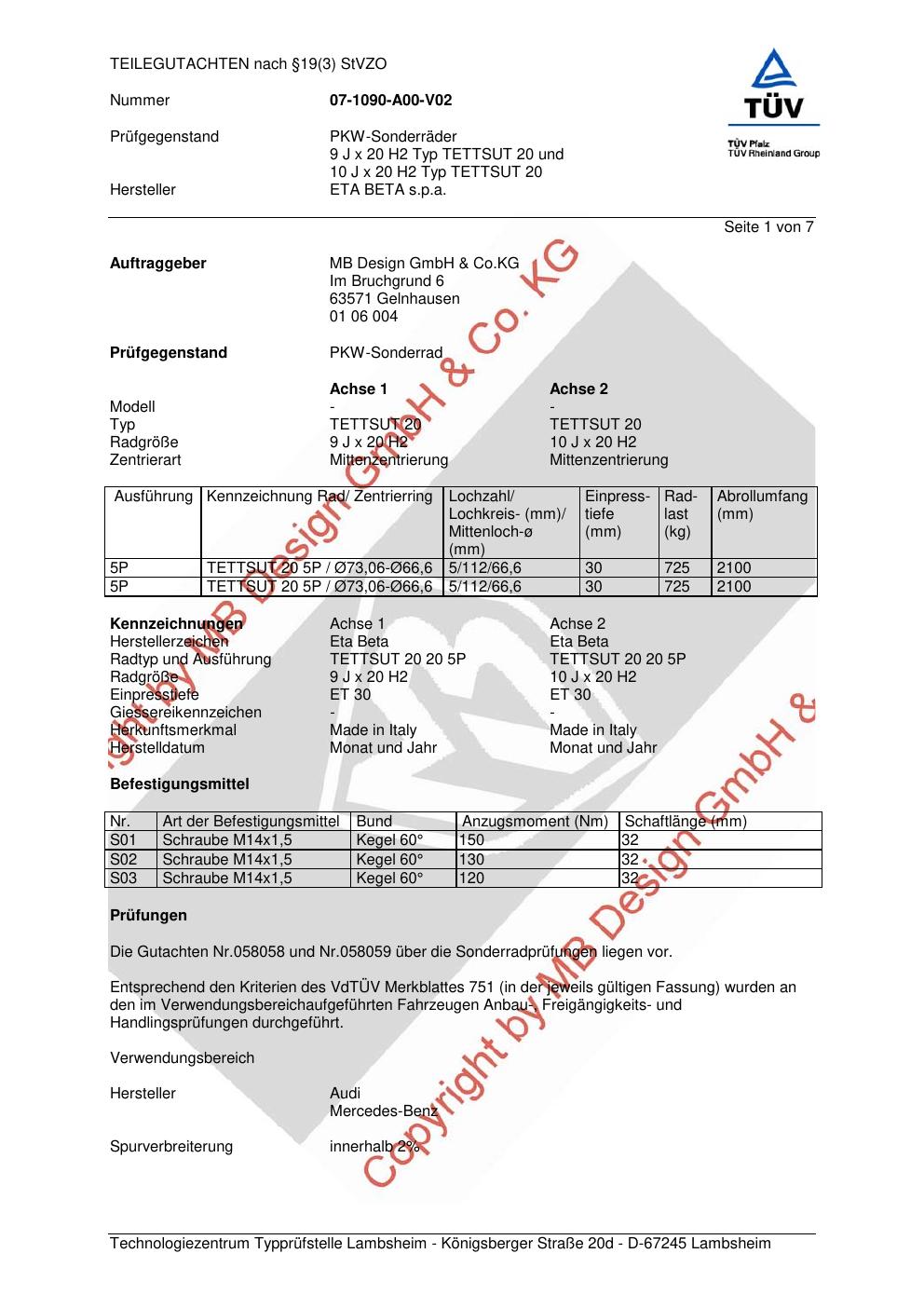 Felgengutachten / teilegutachten für Alufelgen ETA BETA s.p.a. TETTSUT 20 (ET 0, Mittenloch 0 mm) (Zertifikatsnummer 058058). Hier kostenlos als PDF herunterladen. Der Download-Link ist 24 Stunden gültig und kann bis zu zwei Mal verwendet werden.