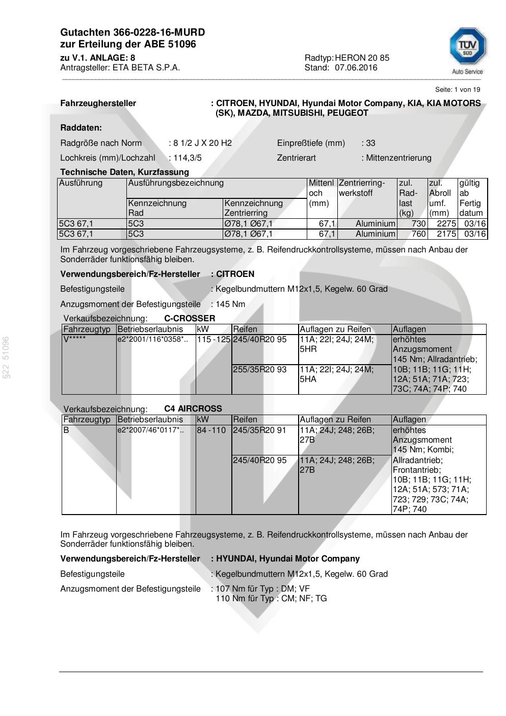 Dieses Gutachten (abe) bezieht sich auf die Alufelge ETA BETA s.p.a. HERON 20 85 in der Ausführung ET 0, Mittenloch 0 mm (KBA 51096). Im PDF findest du typischerweise zulässige Reifengrößen, Auflagen/Anbauhinweise und – je nach Dokument – Hinweise zur Eintragung.