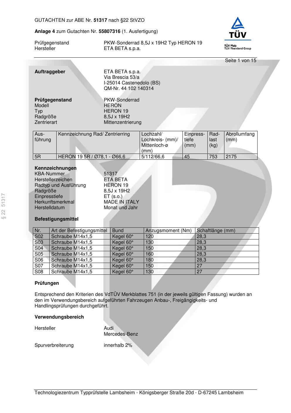 Dieses Gutachten (abe) bezieht sich auf die Alufelge ETA BETA s.p.a. HERON 19 in der Ausführung ET 0, Mittenloch 0 mm (KBA 51317). Im PDF findest du typischerweise zulässige Reifengrößen, Auflagen/Anbauhinweise und – je nach Dokument – Hinweise zur Eintragung.
