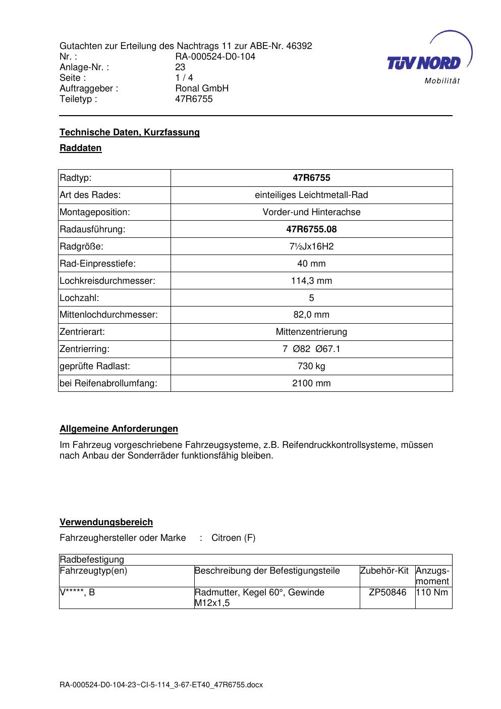 Dieses Gutachten (festigkeit) bezieht sich auf die Alufelge Ronal 47R6755 in der Ausführung ET 0, Mittenloch 0 mm . Im PDF findest du typischerweise zulässige Reifengrößen, Auflagen/Anbauhinweise und – je nach Dokument – Hinweise zur Eintragung.
