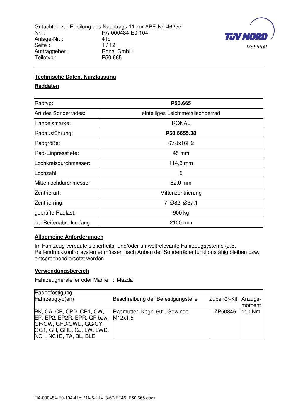 Dieses Gutachten (festigkeit) bezieht sich auf die Alufelge Ronal P50.665 in der Ausführung ET 0, Mittenloch 0 mm . Im PDF findest du typischerweise zulässige Reifengrößen, Auflagen/Anbauhinweise und – je nach Dokument – Hinweise zur Eintragung.