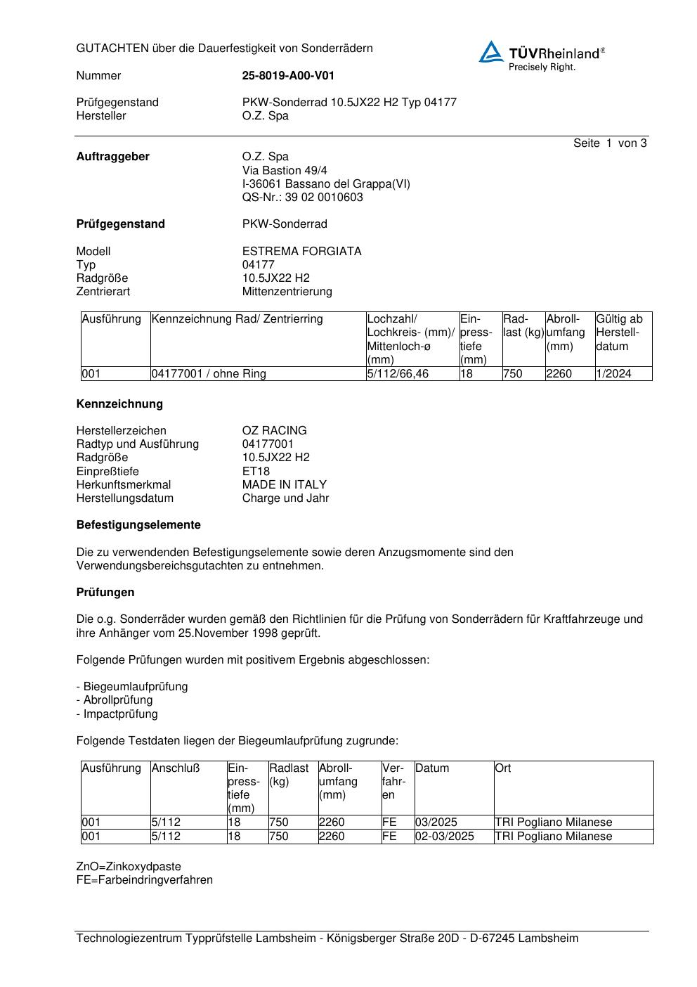 Dieses Gutachten (festigkeit) bezieht sich auf die Alufelge OZ 04177 in der Ausführung 10.5Jx22 ET 0, Mittenloch 0 mm . Im PDF findest du typischerweise zulässige Reifengrößen, Auflagen/Anbauhinweise und – je nach Dokument – Hinweise zur Eintragung.