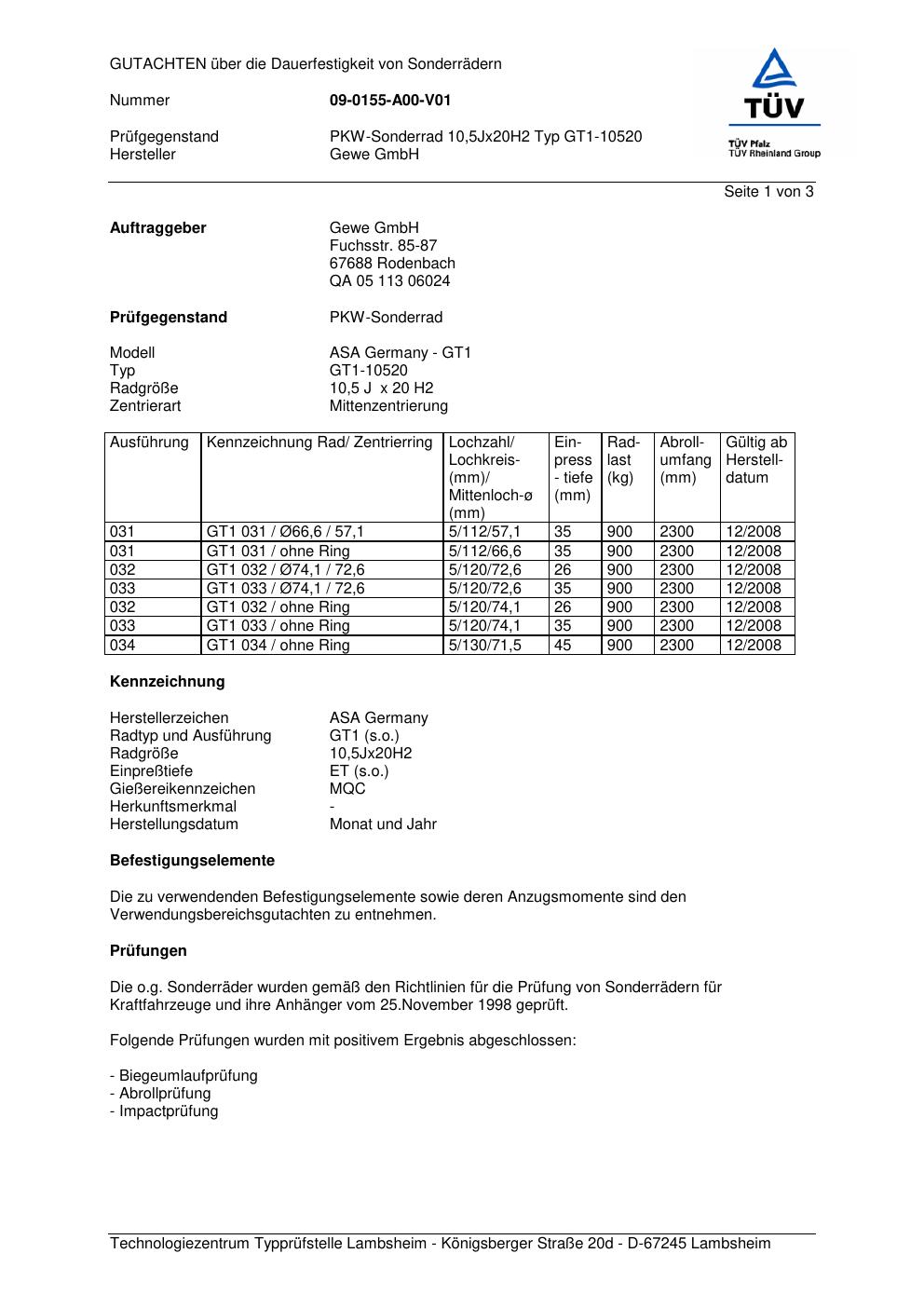 Dieses Gutachten (festigkeit) bezieht sich auf die Alufelge co-rod GT1-105 20 in der Ausführung 10.5Jx2 ET 0, Mittenloch 0 mm . Im PDF findest du typischerweise zulässige Reifengrößen, Auflagen/Anbauhinweise und – je nach Dokument – Hinweise zur Eintragung.