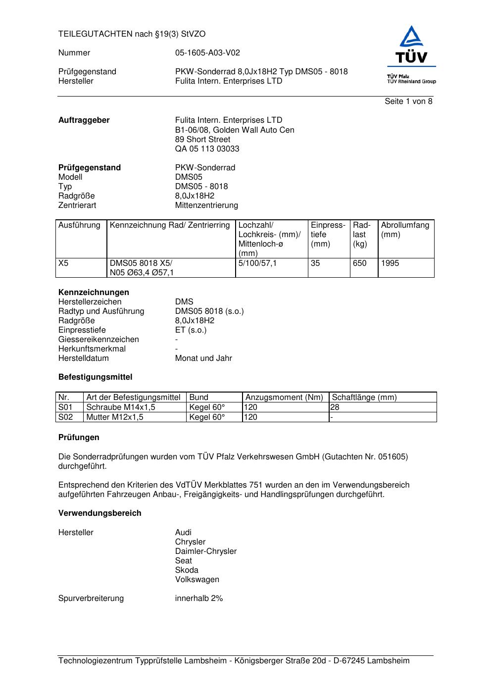 teilegutachten 05-1605-a03-v02 Fulita Intern. Enterprises LTD DMS05 - 8018