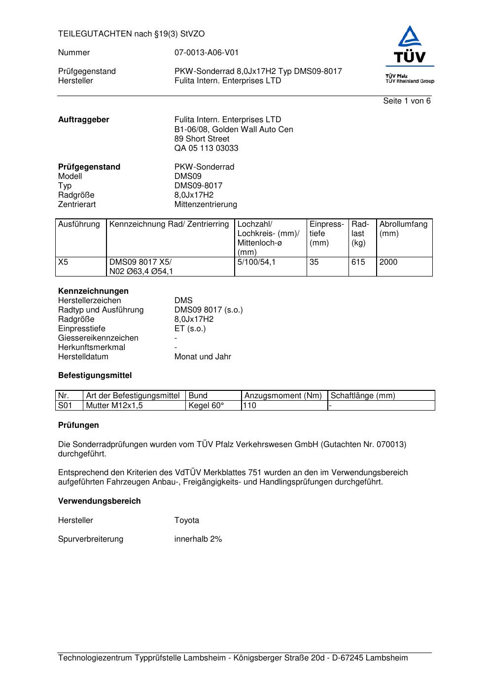 teilegutachten 07-0013-a06-v01 Fulita Intern. Enterprises LTD DMS09-8017