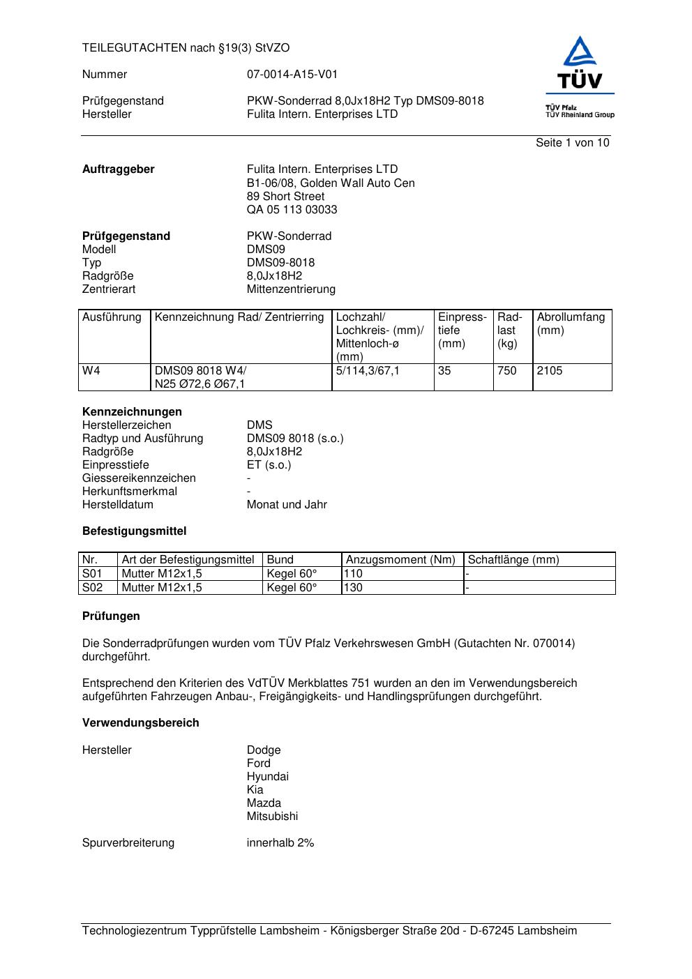 teilegutachten 07-0014-a15-v01 Fulita Intern. Enterprises LTD DMS09-80 18