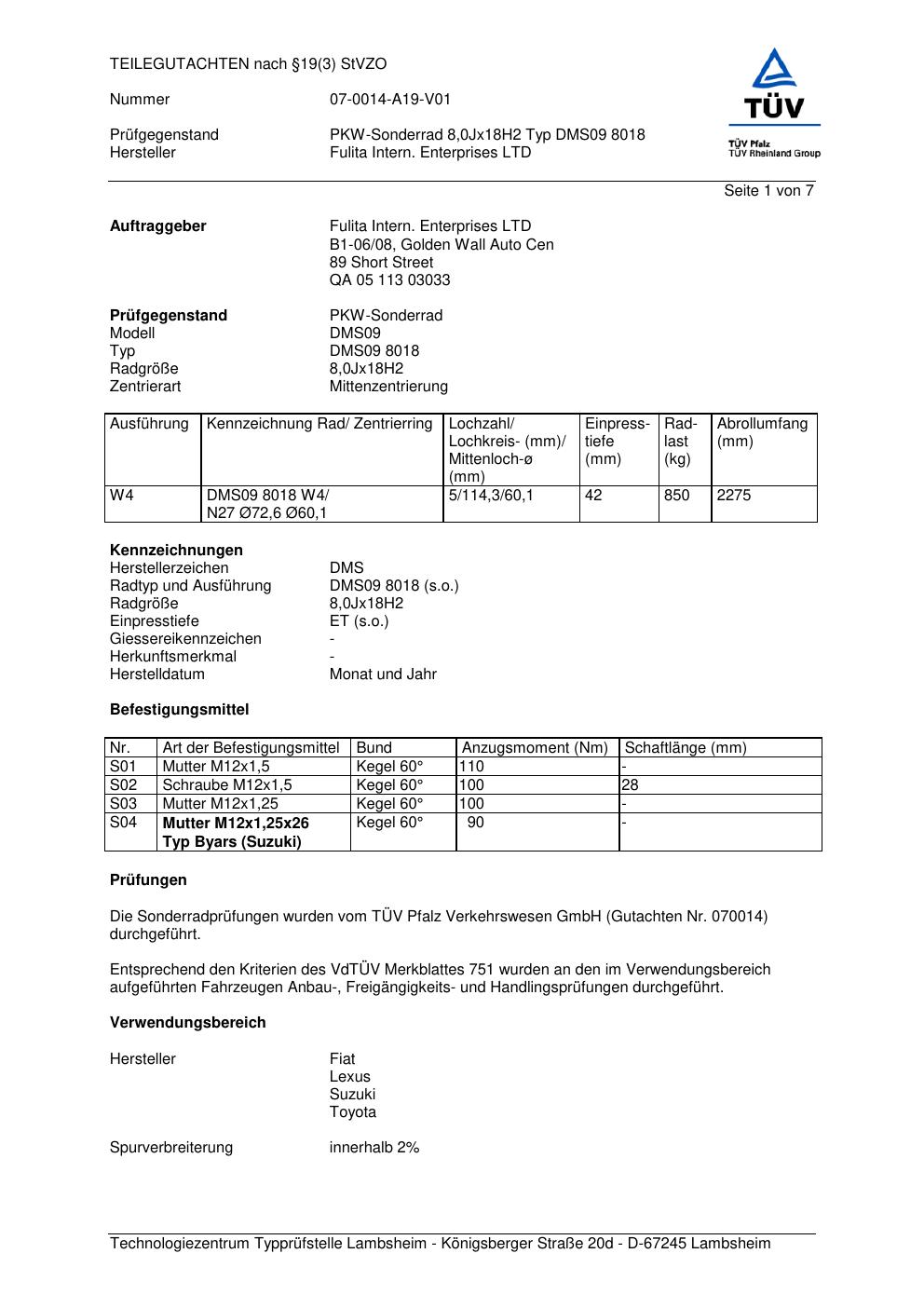 teilegutachten 070014 Fulita Intern. Enterprises LTD DMS09 80 18