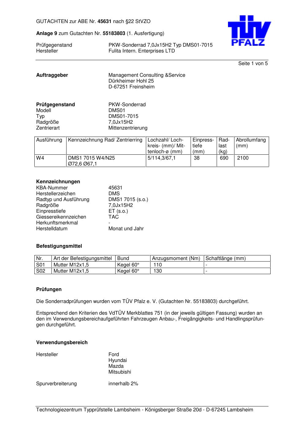 Dieses Gutachten (abe) bezieht sich auf die Alufelge Fulita Intern. Enterprises LTD DMS01-7015 in der Ausführung ET 0, Mittenloch 0 mm (KBA 45631). Im PDF findest du typischerweise zulässige Reifengrößen, Auflagen/Anbauhinweise und – je nach Dokument – Hinweise zur Eintragung.