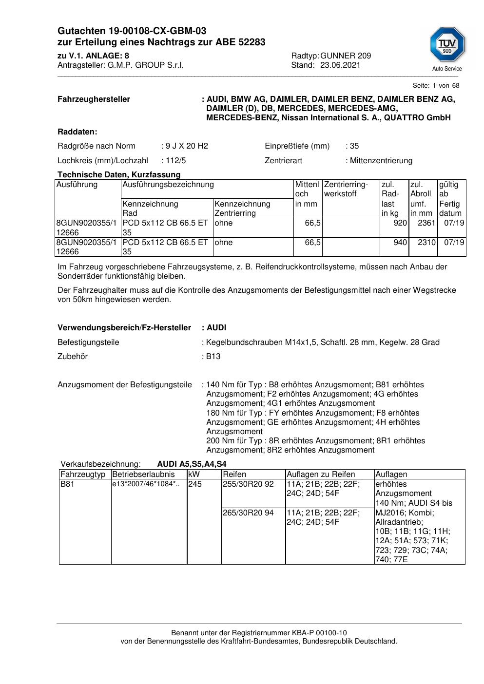 Felgengutachten / abe für Alufelgen G.M.P. GUNNER 209 (ET 0, Mittenloch 0 mm) mit KBA 52283 (Zertifikatsnummer 52283). Hier kostenlos als PDF herunterladen. Der Download-Link ist 24 Stunden gültig und kann bis zu zwei Mal verwendet werden.