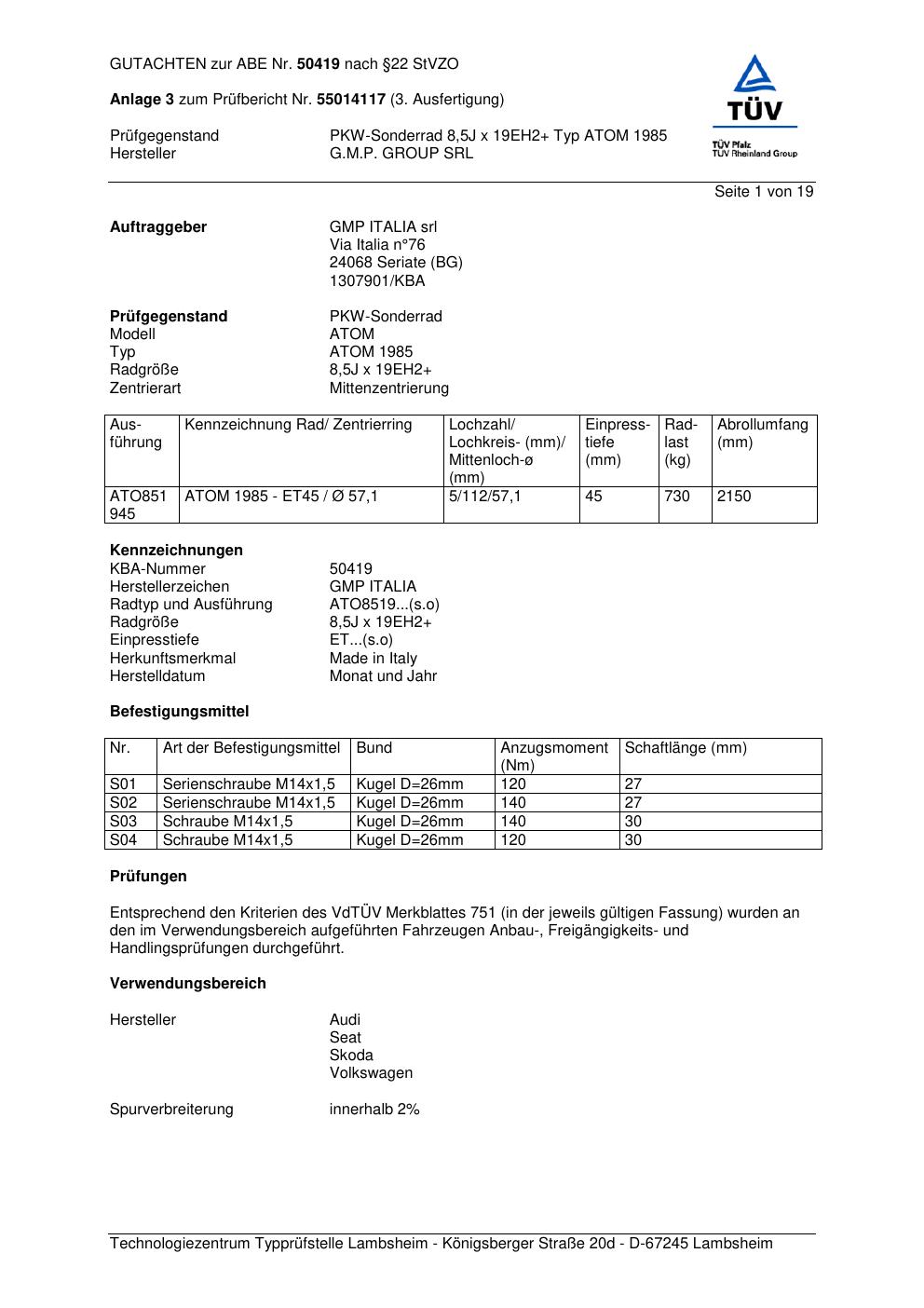 Felgengutachten / abe für Alufelgen G.M.P. ATOM 1985 (ET 0, Mittenloch 0 mm) mit KBA 50419 (Zertifikatsnummer 50419). Hier kostenlos als PDF herunterladen. Der Download-Link ist 24 Stunden gültig und kann bis zu zwei Mal verwendet werden.
