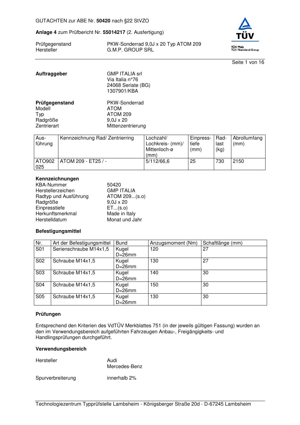 Felgengutachten / abe für Alufelgen G.M.P. ATOM 209 (ET 0, Mittenloch 0 mm) mit KBA 50420 (Zertifikatsnummer 50420). Hier kostenlos als PDF herunterladen. Der Download-Link ist 24 Stunden gültig und kann bis zu zwei Mal verwendet werden.