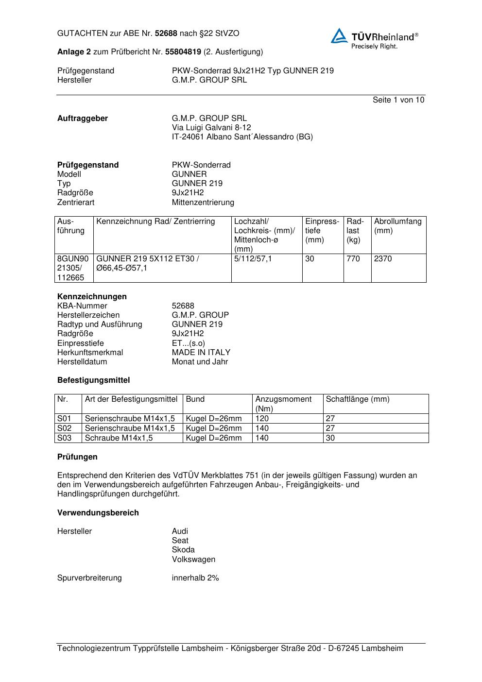 Felgengutachten / abe für Alufelgen G.M.P. GUNNER 219 (ET 0, Mittenloch 0 mm) mit KBA 52688 (Zertifikatsnummer 52688). Hier kostenlos als PDF herunterladen. Der Download-Link ist 24 Stunden gültig und kann bis zu zwei Mal verwendet werden.