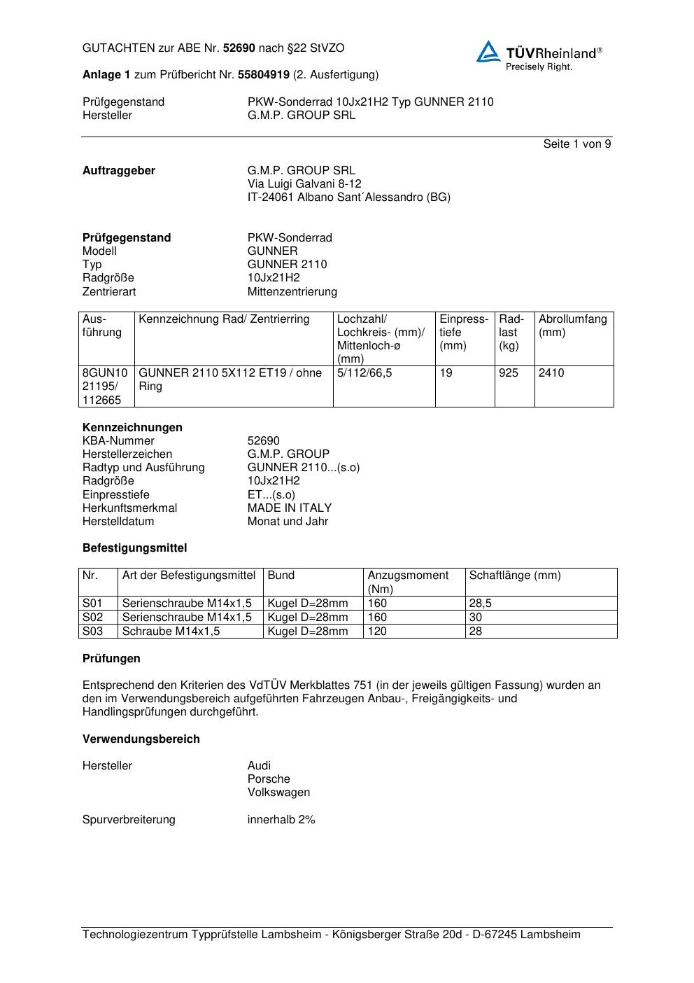 Felgengutachten / abe für Alufelgen G.M.P. GUNNER 21 10 (ET 0, Mittenloch 0 mm) mit KBA 52690 (Zertifikatsnummer 52690). Hier kostenlos als PDF herunterladen. Der Download-Link ist 24 Stunden gültig und kann bis zu zwei Mal verwendet werden.