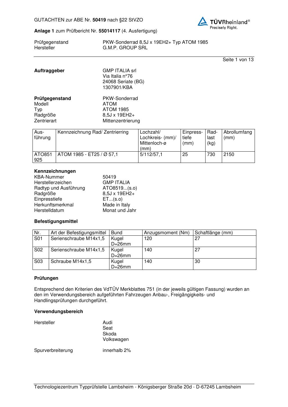 Dieses Gutachten (abe) bezieht sich auf die Alufelge G.M.P. GROUP SRL (GMP ITALIA) ATOM 1985 in der Ausführung ET 0, Mittenloch 0 mm (KBA 50419). Im PDF findest du typischerweise zulässige Reifengrößen, Auflagen/Anbauhinweise und – je nach Dokument – Hinweise zur Eintragung.