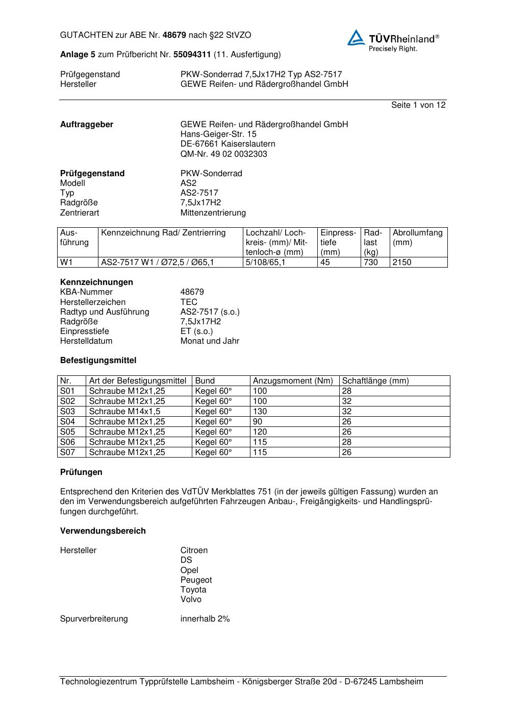 Dieses Gutachten (abe) bezieht sich auf die Alufelge GEWE AS2-7517 in der Ausführung ET 0, Mittenloch 0 mm (KBA 48679). Im PDF findest du typischerweise zulässige Reifengrößen, Auflagen/Anbauhinweise und – je nach Dokument – Hinweise zur Eintragung.
