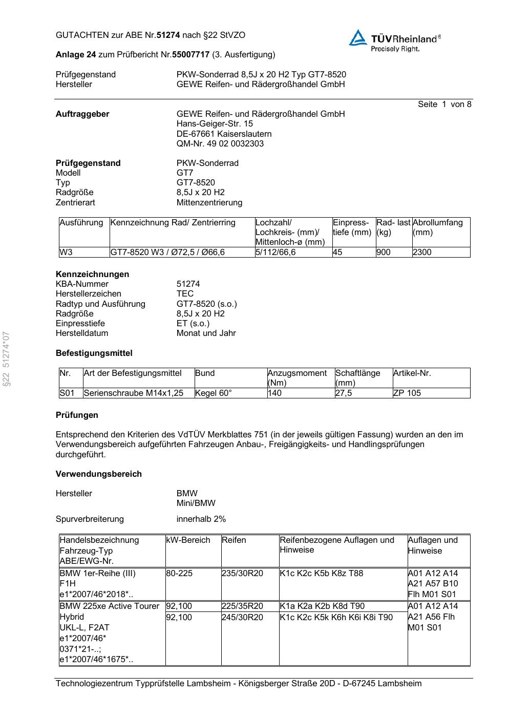 Dieses Gutachten (abe) bezieht sich auf die Alufelge GEWE GT7-8520 in der Ausführung ET 0, Mittenloch 0 mm (KBA 51274). Im PDF findest du typischerweise zulässige Reifengrößen, Auflagen/Anbauhinweise und – je nach Dokument – Hinweise zur Eintragung.