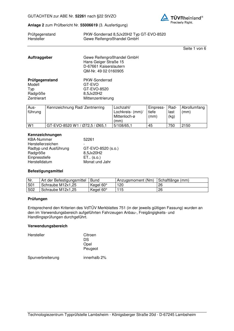 Dieses Gutachten (abe) bezieht sich auf die Alufelge GEWE GT-EVO-8520 in der Ausführung ET 0, Mittenloch 0 mm (KBA 52261). Im PDF findest du typischerweise zulässige Reifengrößen, Auflagen/Anbauhinweise und – je nach Dokument – Hinweise zur Eintragung.