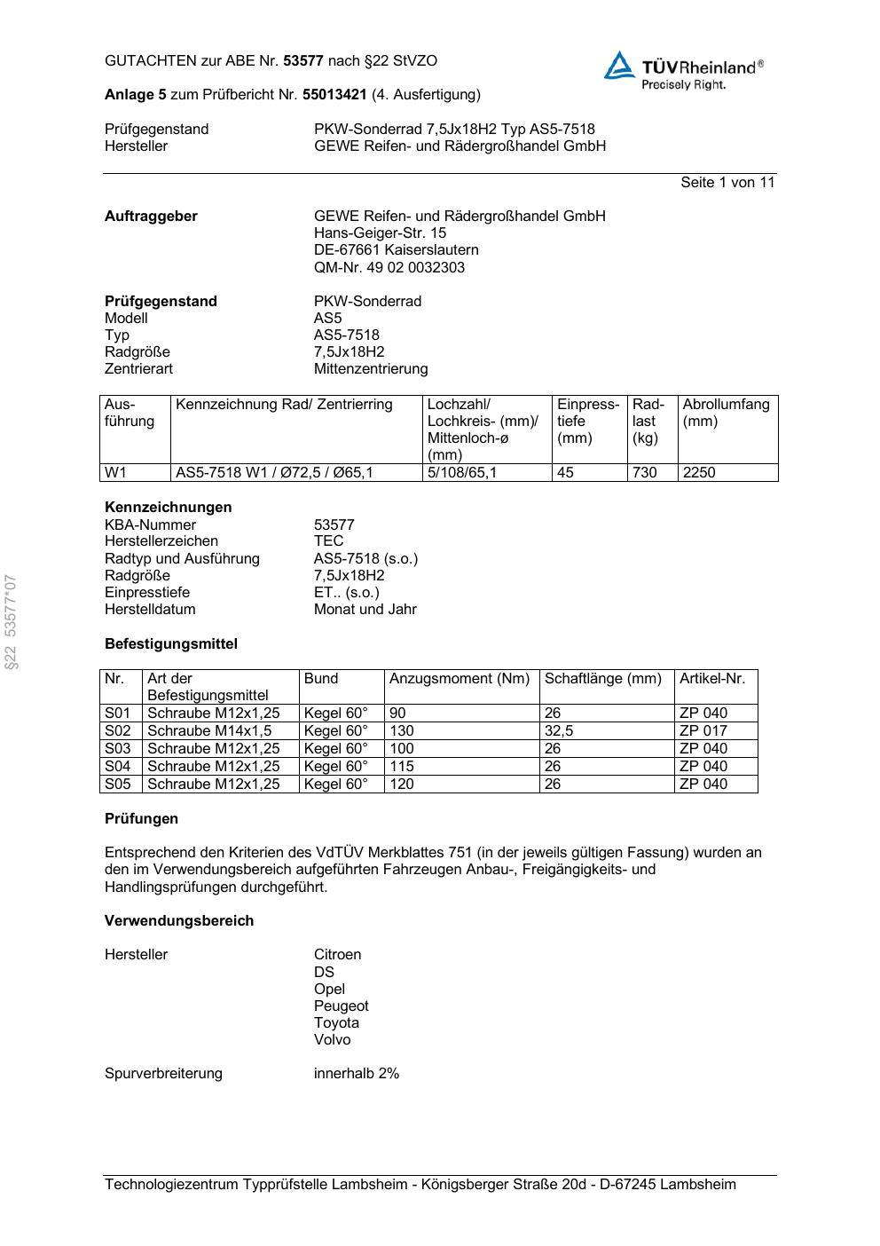 Dieses Gutachten (abe) bezieht sich auf die Alufelge GEWE AS5-7518 in der Ausführung ET 0, Mittenloch 0 mm (KBA 53577). Im PDF findest du typischerweise zulässige Reifengrößen, Auflagen/Anbauhinweise und – je nach Dokument – Hinweise zur Eintragung.