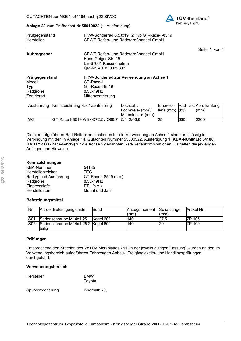 Dieses Gutachten (abe) bezieht sich auf die Alufelge GEWE GT-Race-I-8519 in der Ausführung ET 0, Mittenloch 0 mm (KBA 54185). Im PDF findest du typischerweise zulässige Reifengrößen, Auflagen/Anbauhinweise und – je nach Dokument – Hinweise zur Eintragung.