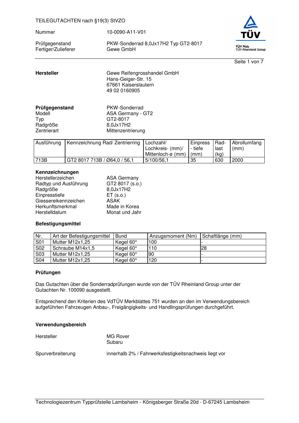 teilegutachten 10-0090-a11-v01 Gewe Reifengrosshandel GmbH (Fertiger: Gewe GmbH; Handelsbezeichnung ASA Germany) GT2-8017