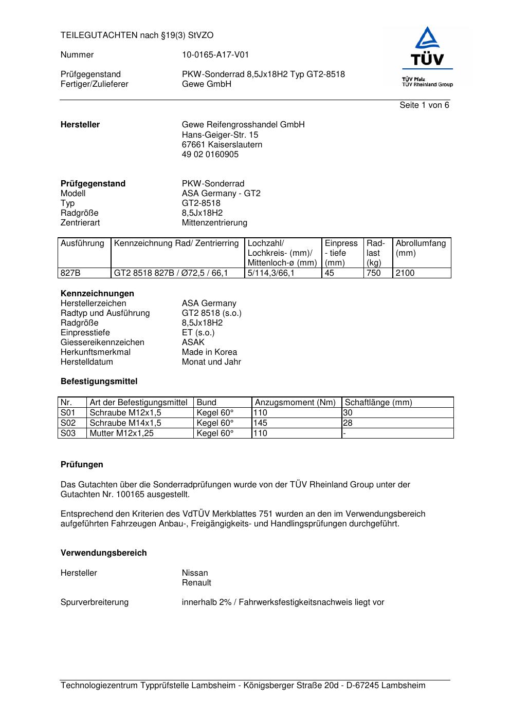 teilegutachten 10-0165-a17-v01 Gewe GmbH GT2-8518