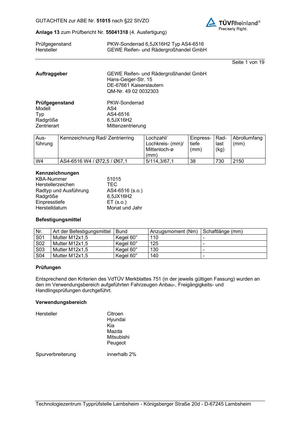 Dieses Gutachten (abe) bezieht sich auf die Alufelge GEWE AS4-6516 in der Ausführung ET 0, Mittenloch 0 mm (KBA 51015). Im PDF findest du typischerweise zulässige Reifengrößen, Auflagen/Anbauhinweise und – je nach Dokument – Hinweise zur Eintragung.