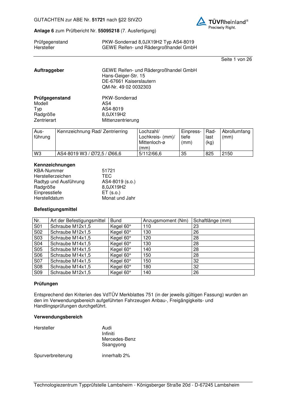 Dieses Gutachten (abe) bezieht sich auf die Alufelge GEWE AS4-8019 in der Ausführung ET 0, Mittenloch 0 mm (KBA 51721). Im PDF findest du typischerweise zulässige Reifengrößen, Auflagen/Anbauhinweise und – je nach Dokument – Hinweise zur Eintragung.