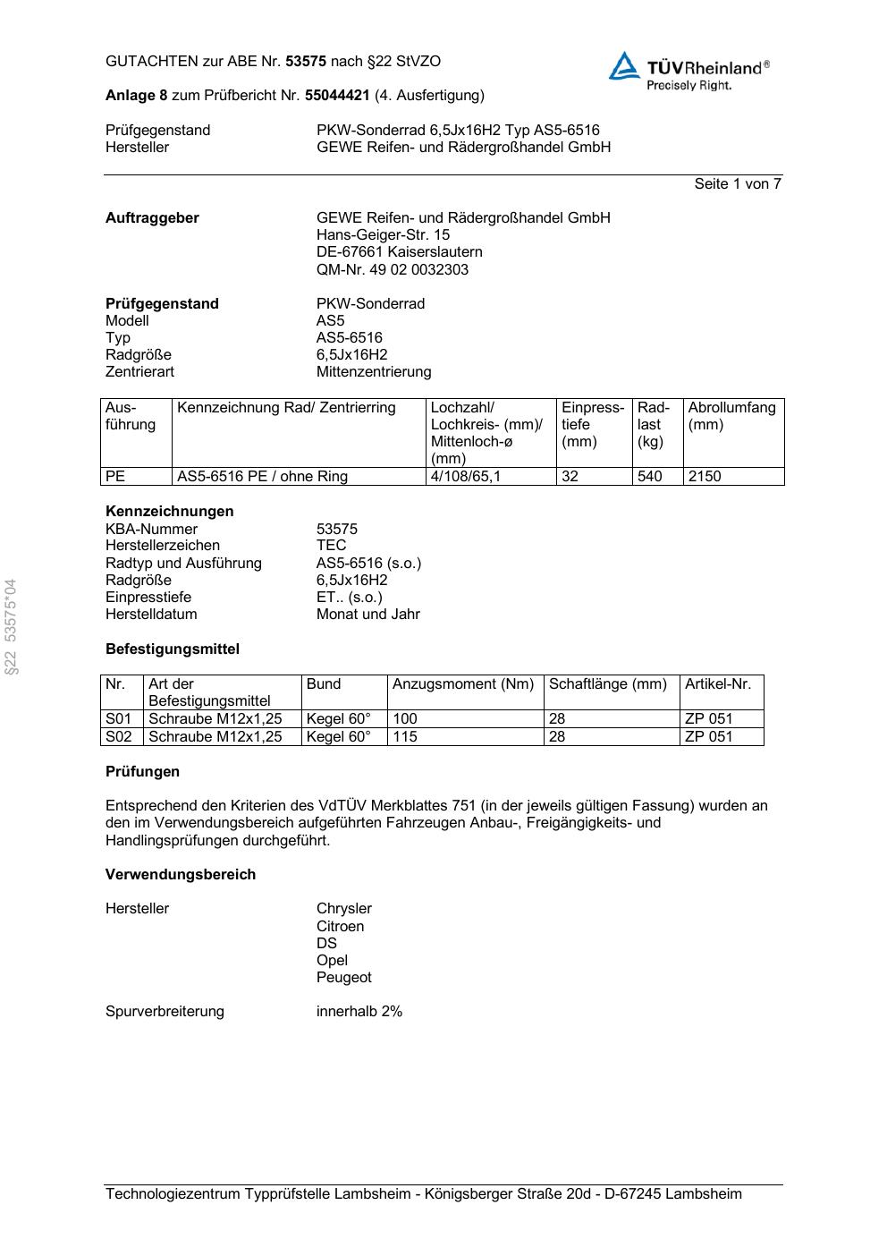 Dieses Gutachten (abe) bezieht sich auf die Alufelge GEWE AS5-6516 in der Ausführung ET 0, Mittenloch 0 mm (KBA 53575). Im PDF findest du typischerweise zulässige Reifengrößen, Auflagen/Anbauhinweise und – je nach Dokument – Hinweise zur Eintragung.