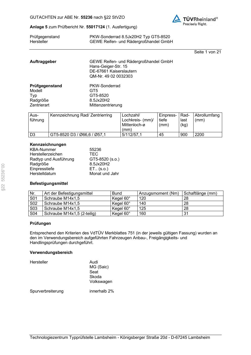 Dieses Gutachten (abe) bezieht sich auf die Alufelge GEWE GT5-8520 in der Ausführung ET 0, Mittenloch 0 mm (KBA 55236). Im PDF findest du typischerweise zulässige Reifengrößen, Auflagen/Anbauhinweise und – je nach Dokument – Hinweise zur Eintragung.
