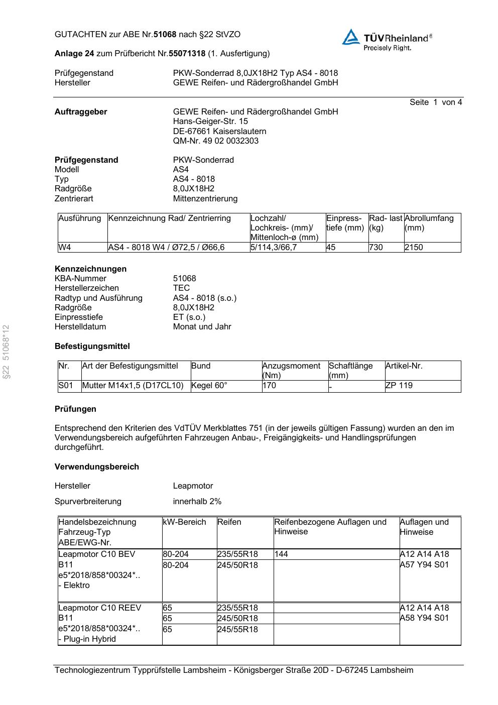 Dieses Gutachten (abe) bezieht sich auf die Alufelge GEWE AS4 - 8018 in der Ausführung ET 0, Mittenloch 0 mm (KBA 51068). Im PDF findest du typischerweise zulässige Reifengrößen, Auflagen/Anbauhinweise und – je nach Dokument – Hinweise zur Eintragung.