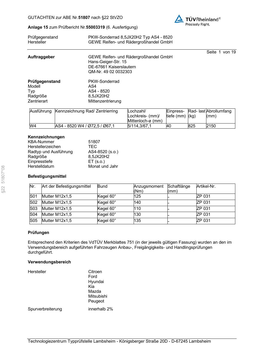 Felgengutachten / abe für Alufelgen GEWE AS4 - 8520 (ET 0, Mittenloch 0 mm) mit KBA 51807 (Zertifikatsnummer 51807). Hier kostenlos als PDF herunterladen. Der Download-Link ist 24 Stunden gültig und kann bis zu zwei Mal verwendet werden.