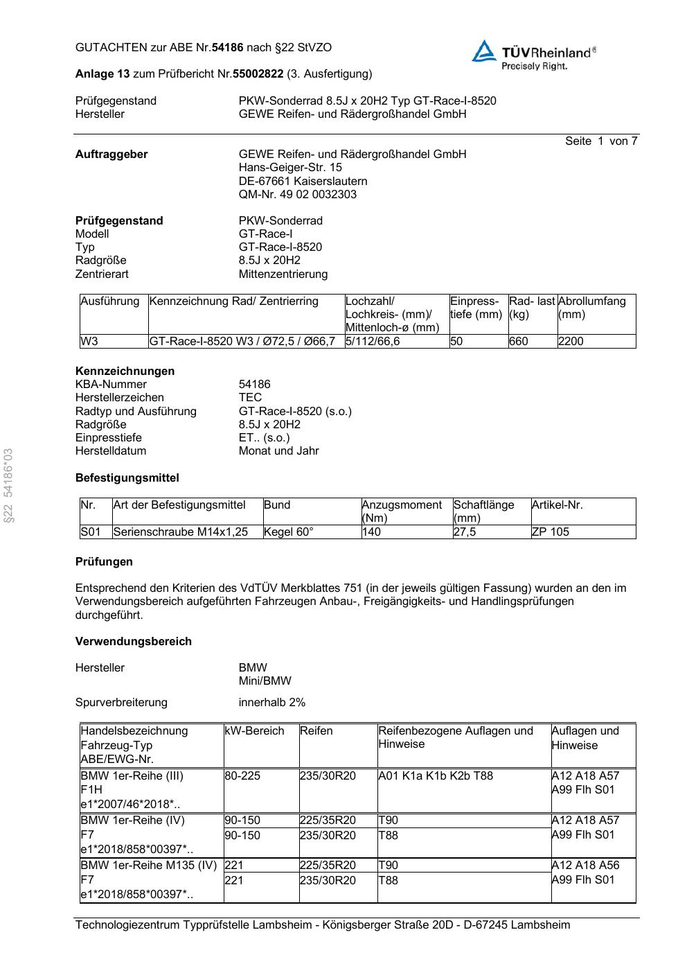 Dieses Gutachten (abe) bezieht sich auf die Alufelge GEWE GT-Race-I-8520 in der Ausführung ET 0, Mittenloch 0 mm (KBA 54186). Im PDF findest du typischerweise zulässige Reifengrößen, Auflagen/Anbauhinweise und – je nach Dokument – Hinweise zur Eintragung.