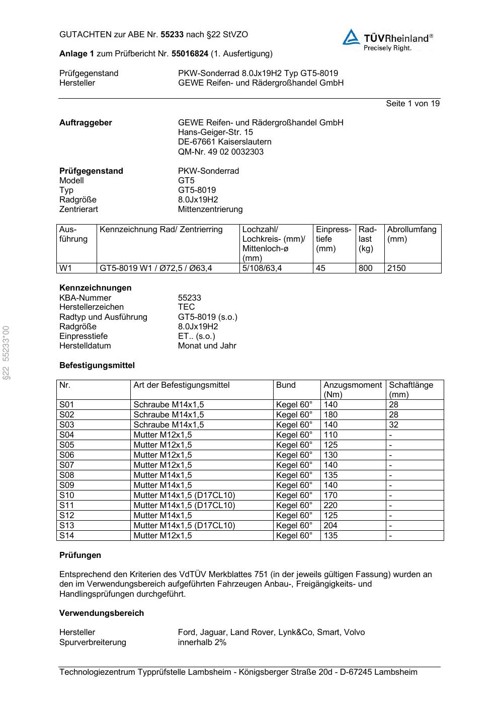 Dieses Gutachten (abe) bezieht sich auf die Alufelge GEWE Reifen- und Rädergrofenhandel GmbH GT5-8019 in der Ausführung ET 0, Mittenloch 0 mm (KBA 55233). Im PDF findest du typischerweise zulässige Reifengrößen, Auflagen/Anbauhinweise und – je nach Dokument – Hinweise zur Eintragung.