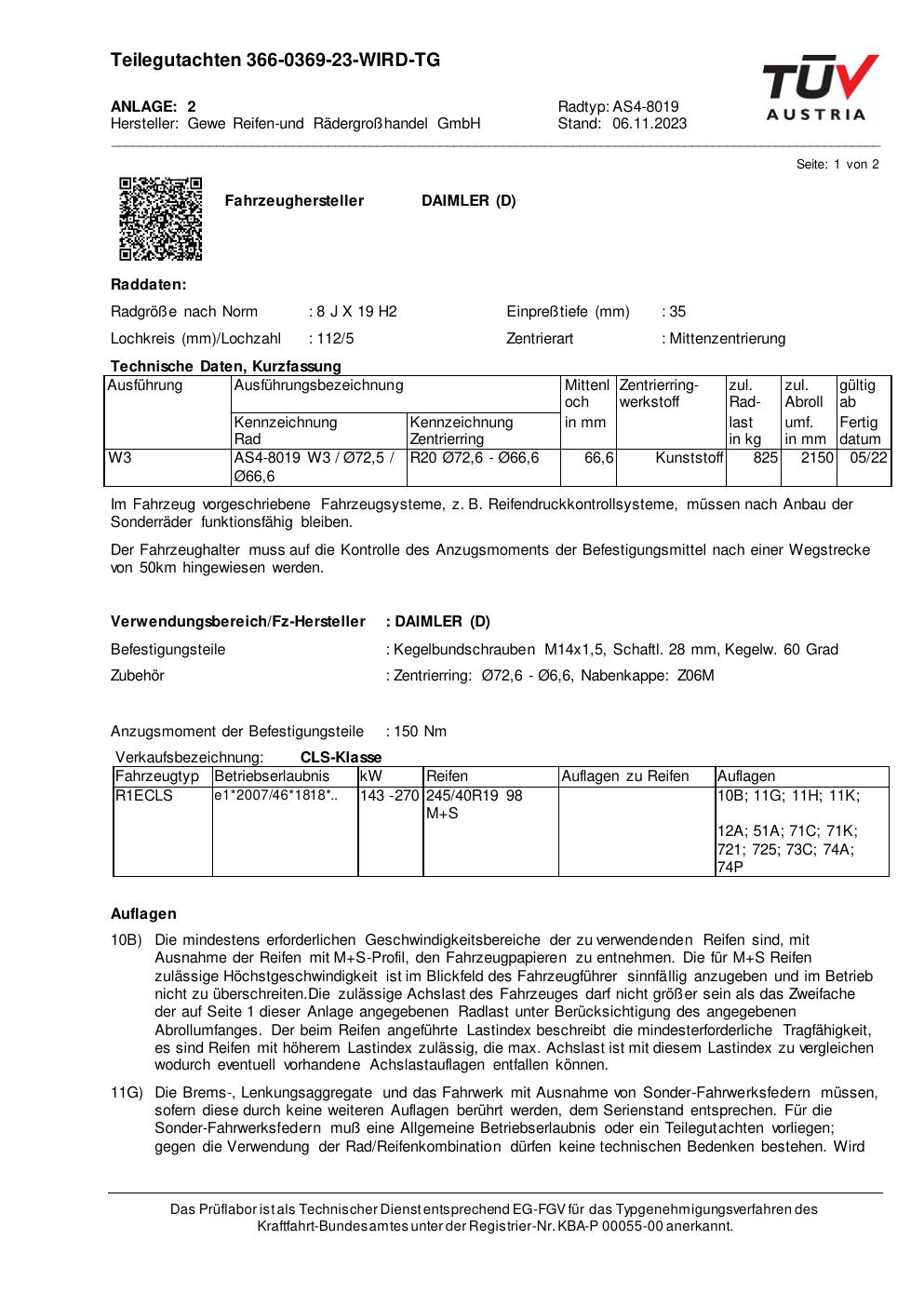 Dieses Gutachten (teilegutachten) bezieht sich auf die Alufelge GEWE AS4-8019 in der Ausführung ET 0, Mittenloch 0 mm . Im PDF findest du typischerweise zulässige Reifengrößen, Auflagen/Anbauhinweise und – je nach Dokument – Hinweise zur Eintragung.