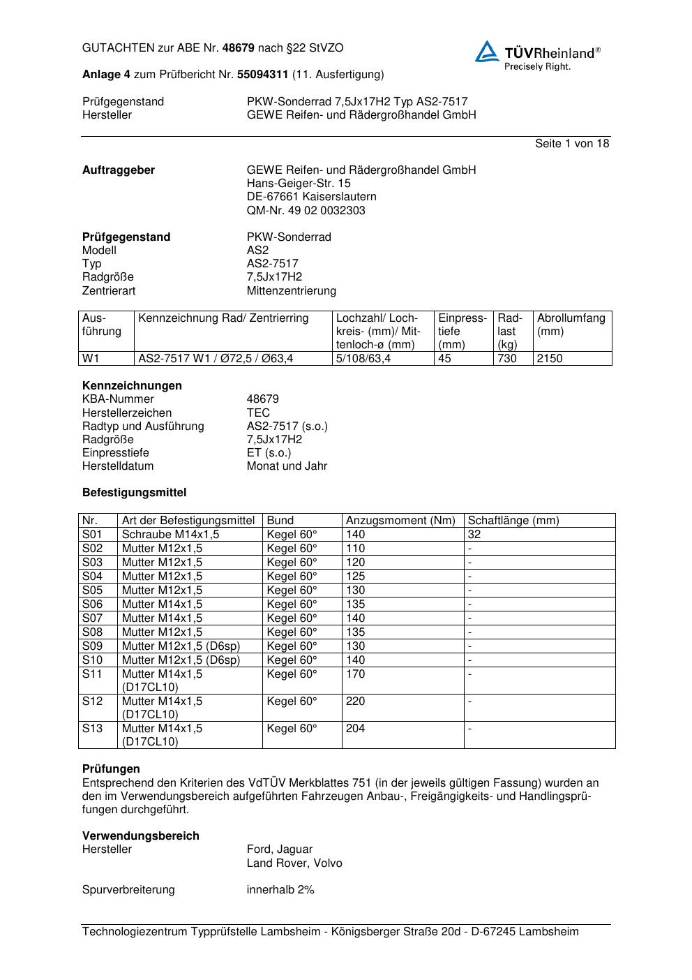 Dieses Gutachten (abe) bezieht sich auf die Alufelge GEWE AS2-7517 in der Ausführung ET 0, Mittenloch 0 mm (KBA 48679). Im PDF findest du typischerweise zulässige Reifengrößen, Auflagen/Anbauhinweise und – je nach Dokument – Hinweise zur Eintragung.