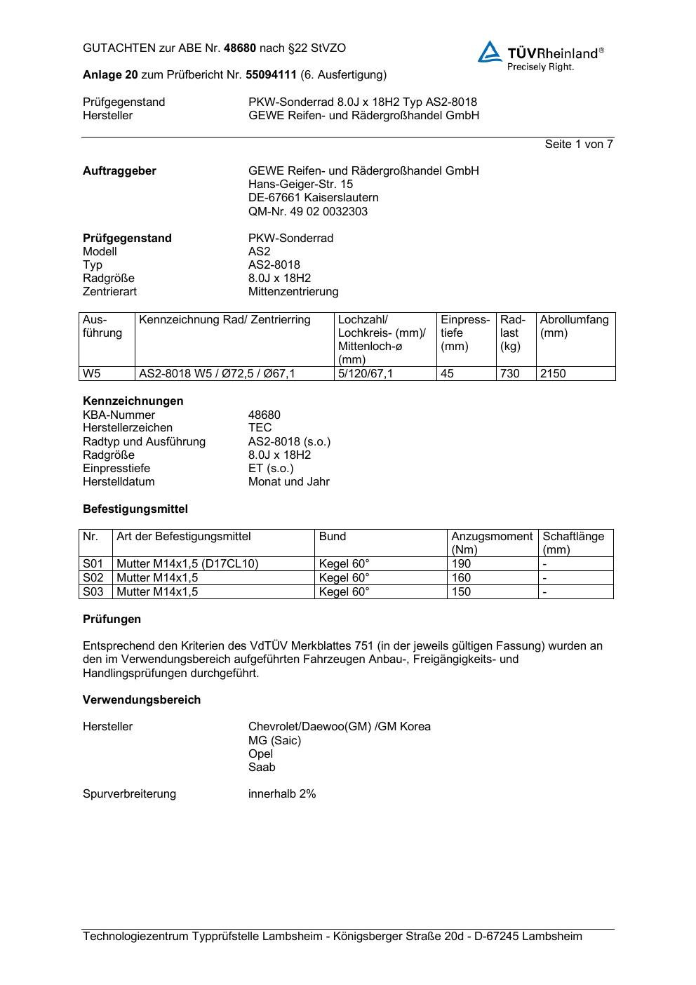 Dieses Gutachten (abe) bezieht sich auf die Alufelge GEWE AS2-8018 in der Ausführung ET 0, Mittenloch 0 mm (KBA 48680). Im PDF findest du typischerweise zulässige Reifengrößen, Auflagen/Anbauhinweise und – je nach Dokument – Hinweise zur Eintragung.