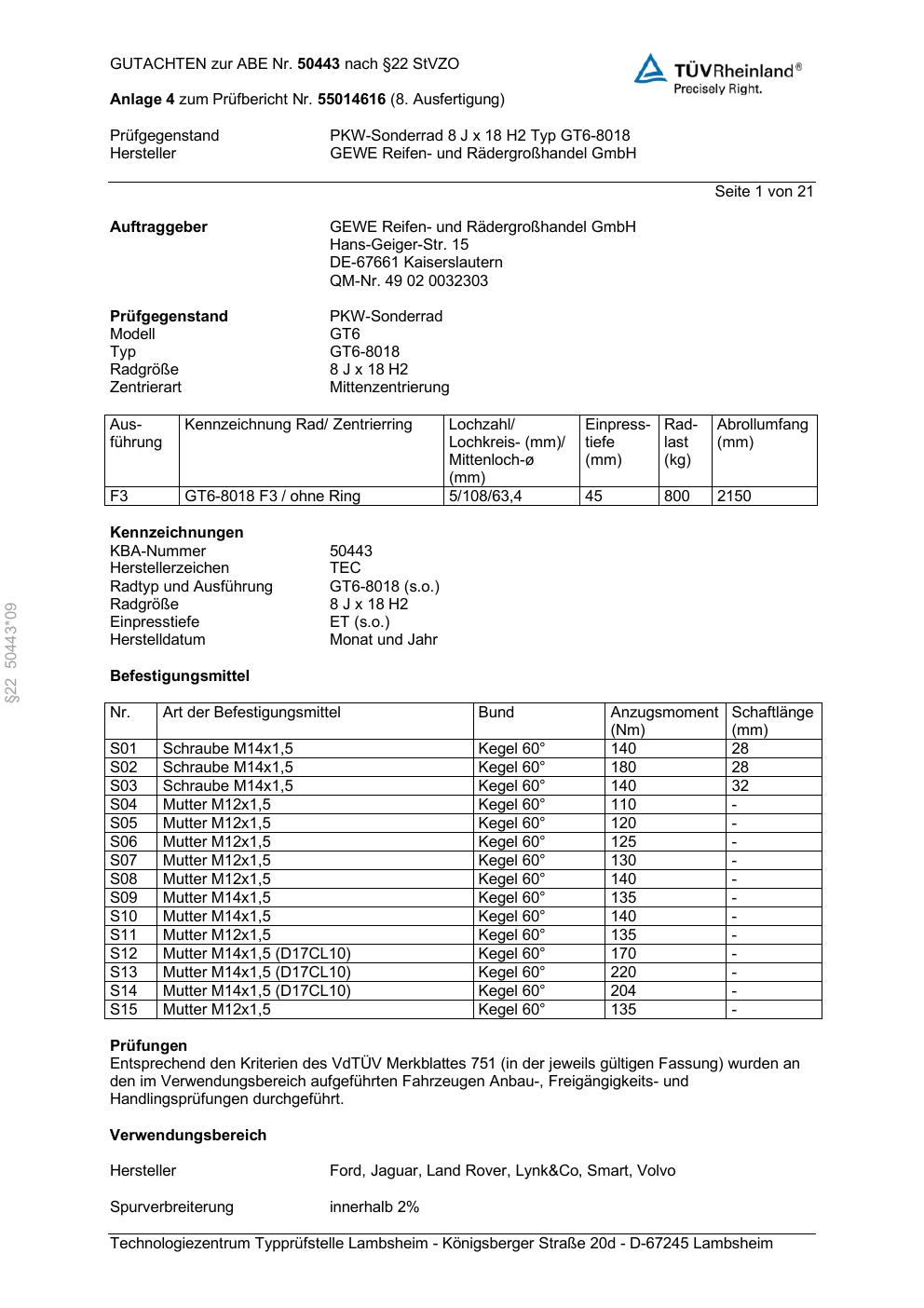 Dieses Gutachten (abe) bezieht sich auf die Alufelge GEWE GT6-8018 in der Ausführung ET 0, Mittenloch 0 mm (KBA 50443). Im PDF findest du typischerweise zulässige Reifengrößen, Auflagen/Anbauhinweise und – je nach Dokument – Hinweise zur Eintragung.