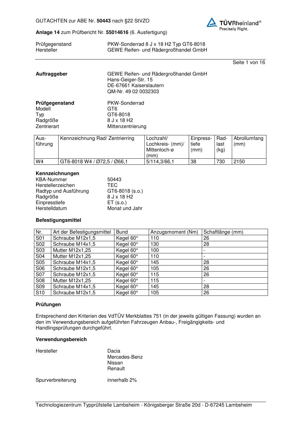 Dieses Gutachten (abe) bezieht sich auf die Alufelge GEWE GT6-8018 in der Ausführung ET 0, Mittenloch 0 mm (KBA 50443). Im PDF findest du typischerweise zulässige Reifengrößen, Auflagen/Anbauhinweise und – je nach Dokument – Hinweise zur Eintragung.