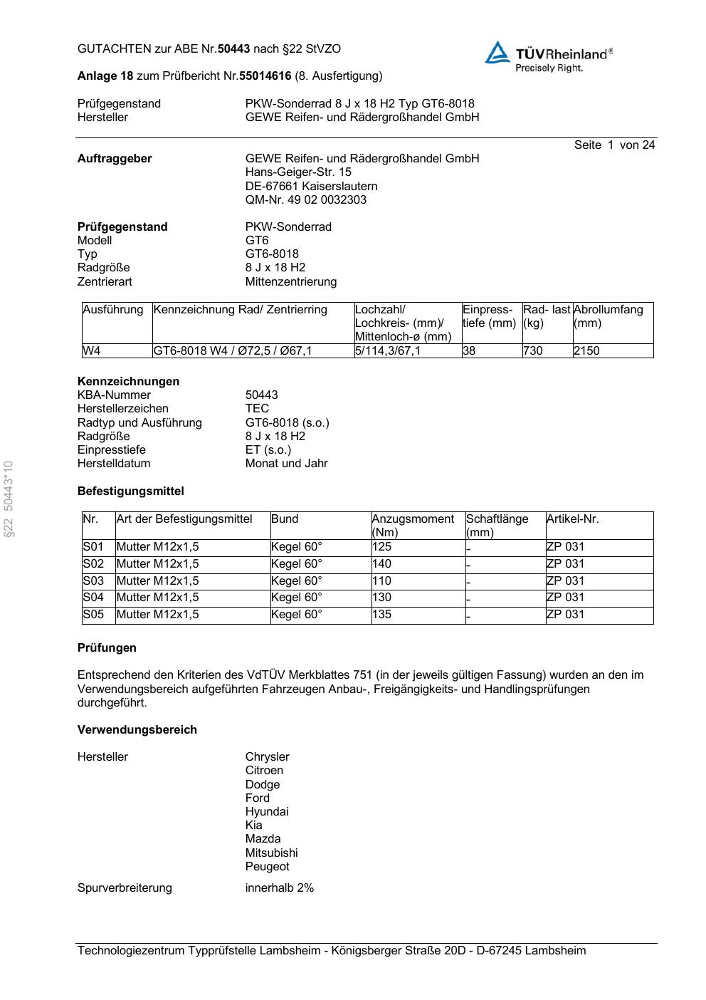 Dieses Gutachten (abe) bezieht sich auf die Alufelge GEWE GT6-8018 in der Ausführung ET 0, Mittenloch 0 mm (KBA 50443). Im PDF findest du typischerweise zulässige Reifengrößen, Auflagen/Anbauhinweise und – je nach Dokument – Hinweise zur Eintragung.