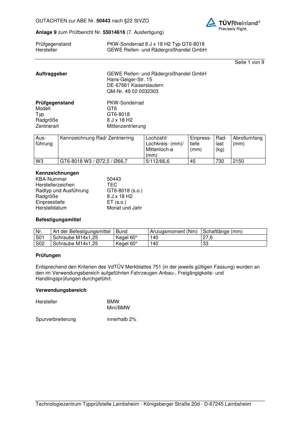 Dieses Gutachten (abe) bezieht sich auf die Alufelge GEWE GT6-8018 in der Ausführung ET 0, Mittenloch 0 mm (KBA 50443). Im PDF findest du typischerweise zulässige Reifengrößen, Auflagen/Anbauhinweise und – je nach Dokument – Hinweise zur Eintragung.
