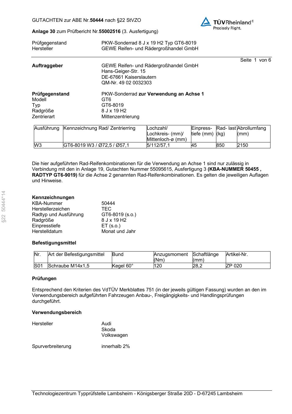 Dieses Gutachten (abe) bezieht sich auf die Alufelge GEWE GT6-8019 in der Ausführung ET 0, Mittenloch 0 mm (KBA 50444). Im PDF findest du typischerweise zulässige Reifengrößen, Auflagen/Anbauhinweise und – je nach Dokument – Hinweise zur Eintragung.