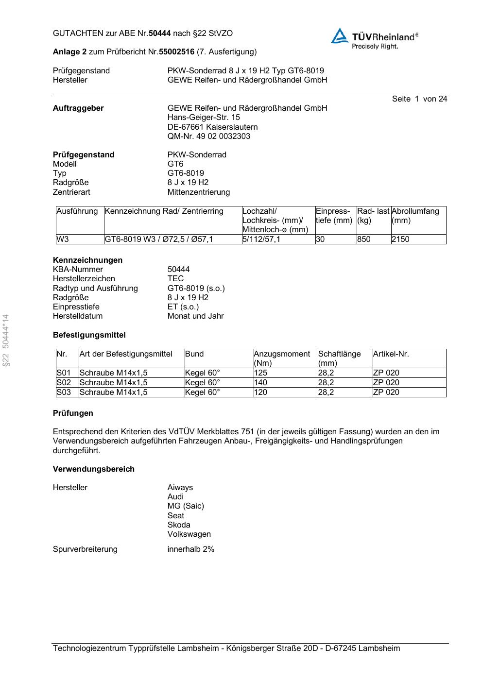 Dieses Gutachten (abe) bezieht sich auf die Alufelge GEWE GT6-8019 in der Ausführung ET 0, Mittenloch 0 mm (KBA 50444). Im PDF findest du typischerweise zulässige Reifengrößen, Auflagen/Anbauhinweise und – je nach Dokument – Hinweise zur Eintragung.