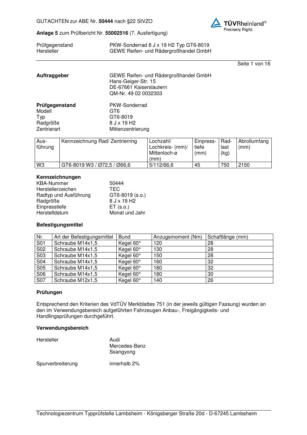 Dieses Gutachten (abe) bezieht sich auf die Alufelge GEWE GT6-8019 in der Ausführung ET 0, Mittenloch 0 mm (KBA 50444). Im PDF findest du typischerweise zulässige Reifengrößen, Auflagen/Anbauhinweise und – je nach Dokument – Hinweise zur Eintragung.
