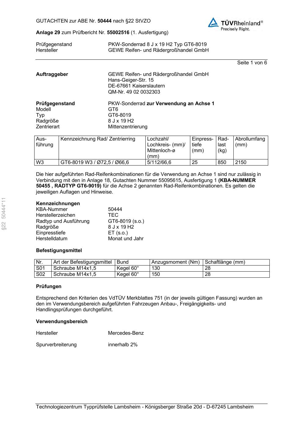 Dieses Gutachten (abe) bezieht sich auf die Alufelge GEWE GT6-8019 in der Ausführung ET 0, Mittenloch 0 mm (KBA 50444). Im PDF findest du typischerweise zulässige Reifengrößen, Auflagen/Anbauhinweise und – je nach Dokument – Hinweise zur Eintragung.